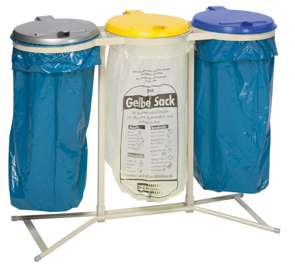 Abfallsammler 3-Fach, mit Füßen, eisenglimmer, Deckel silber, gelb und blau aus Kunststoff, BxTxH 1175x440x950 mm