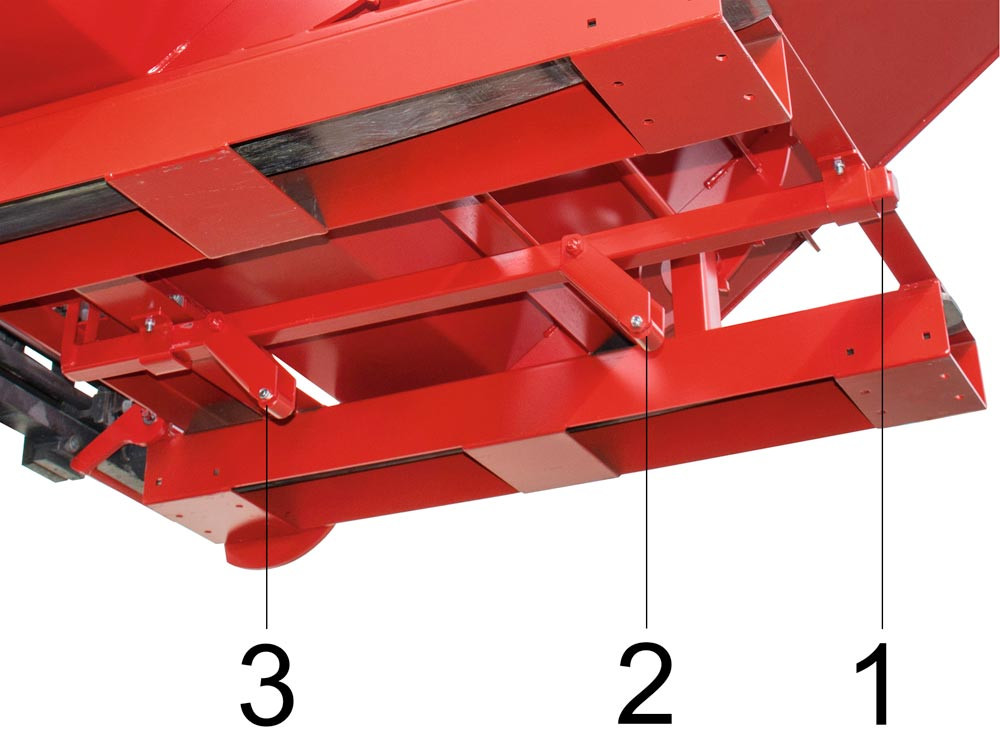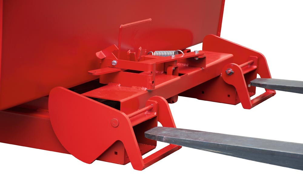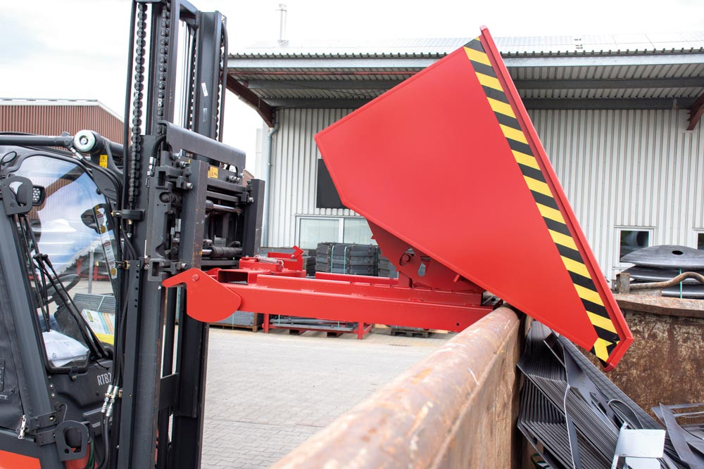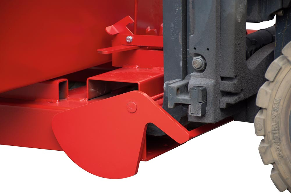 · Wannenblech mit umlaufendem Randprofil · Stabiler Grundrahmen mit Einfahrtaschen · Automatische Sicherung gegen unbeabsichtigtes Abrutschen · Sicherung gegen ungewolltes Auskippen · Günstiger Lastschwerpunkt · 3 automatische Entriegelungspunkte zum versetzten Abkippen über dem Container