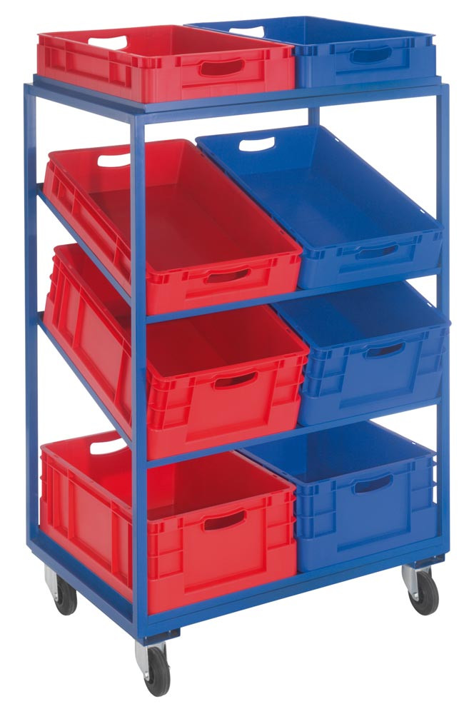 Beistell- und Kommissionierwagen, LxBxH 860x605x1315 mm, 2/2 gerade/schräge Böden, 8 Kästen (2x Gr. 3 rot, 6x Gr. 4 blau), Traglast 230 kg
