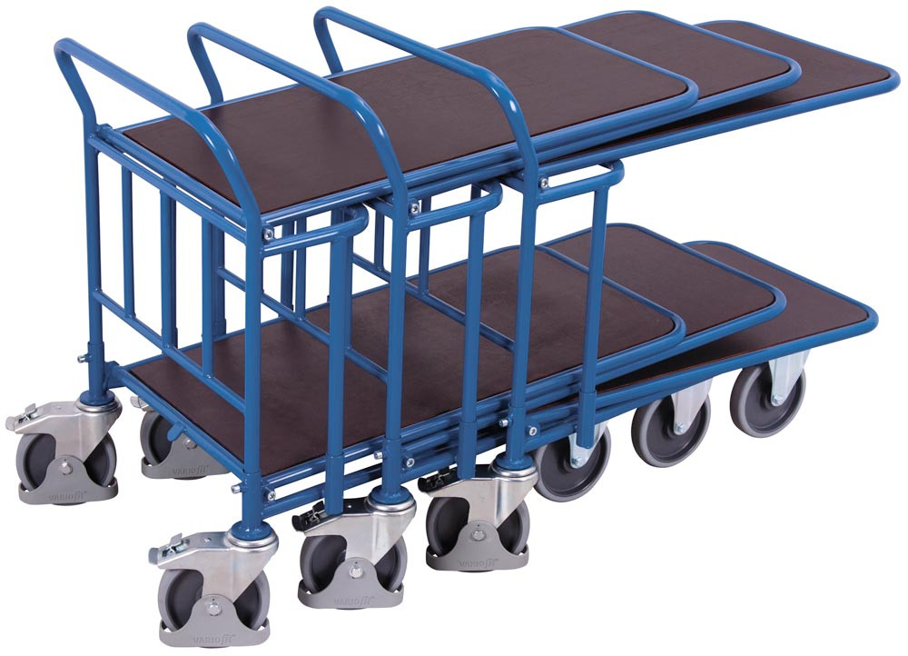 ∙ Ineinanderschiebbare Wagen ∙ 75 % Stellraum-Einsparung ∙ Schweißkonstruktion aus Stahlrohr ∙ RAL 5010 enzianblau pulverbeschichtet ∙ Schlag- und kratzfest ∙ Ladefläche aus rutschsicherer Siebdruckplatte aus wasserfestem Sperrholz ∙ 2 Lenk- und 2 Bockrollen · Lenkrollen gemäß EN 1757-3 mit Rad-Feststeller und Fußschutz · Thermoplastische Vollgummi-Bereifung, grau "spurlos" · Naben mit Präzisions-Rillenkugellager und Fadenschutz