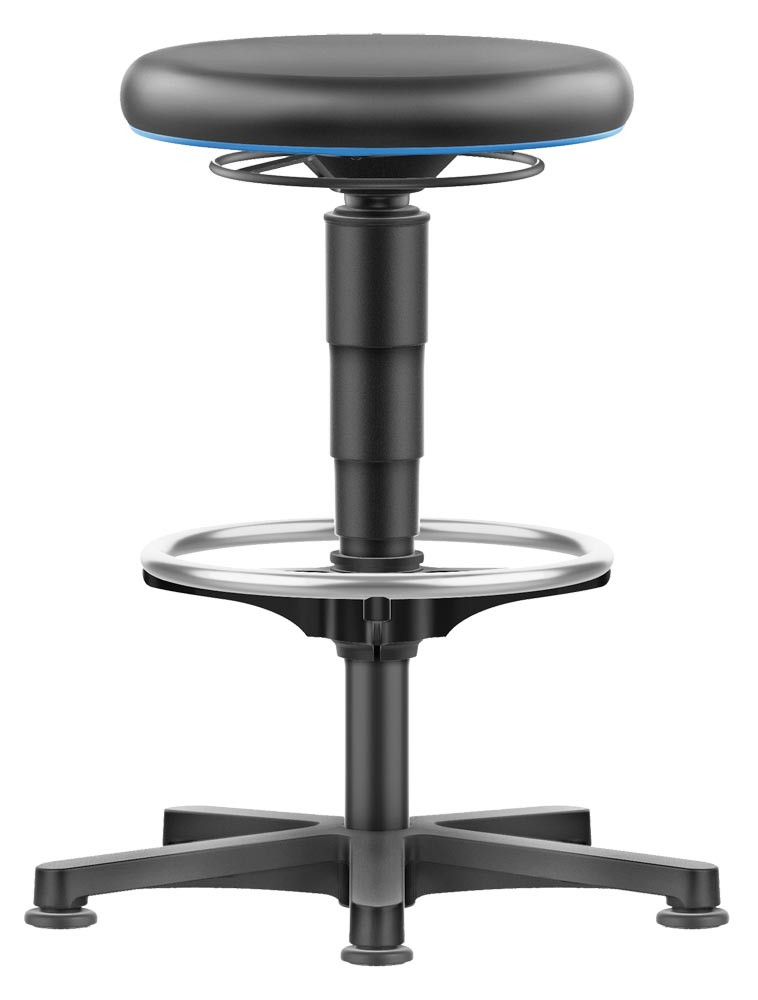· Sehr großer Sitzhöhenverstellbereich · Höhenverstellung durch Ringauslösung · Fugenarm, leicht zu reinigen, desinfizierbar · Fußkreuz aus Kunststoff Ø 540 mm · Platzsparend und leicht mobil · Für Industrie, Dienstleistungen und Labor · Blauer Farbring zum Schutz der Polster