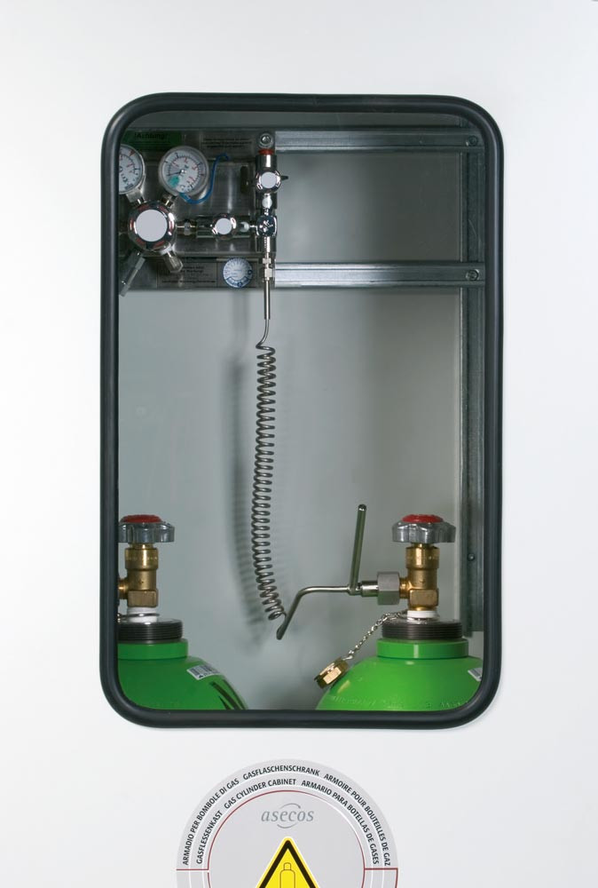 ∙ Hochwertige Stahlblechkonstruktion mit komplett verzinkter und kunststoffbeschichteter Oberfläche in RAL 7035 lichtgrau ∙ Ersetzt die geforderten Schutzbereiche (TRGS 510) um die Gasflaschen ∙ Inklusive Montageschiene, Flaschenhalter und passenden Spanngurten ∙ Edelstahlsockel zum Schutz vor Beschädigungen ∙ Stellfüße für leichtes Ausrichten bei Bodenunebenheiten ∙ Abschließbar mit solider 3-Punkt-Verriegelung über Schwenkhebel