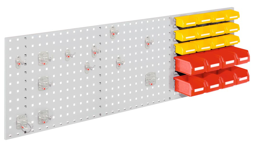 ∙ Einsteigerset bestehend aus: 1 Kombinationsplatte Loch-/ Schlitzplatte 1500 x 450 mm, 12-teiligem Werkzeughaltersortiment, 12 Lagersichtkästen B x T x H 105 x 85 x 45 mm und 8 Lagersichtkästen B x T x H 105 x 160 x 75 mm