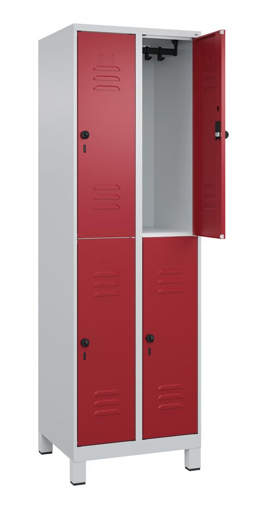 Fächerschrank, doppelstöckig, BxTxH 600x500x1950 mm, 2x2 Fächer, Abt.B 300 mm, Drehriegel, Füße, Farbwahl