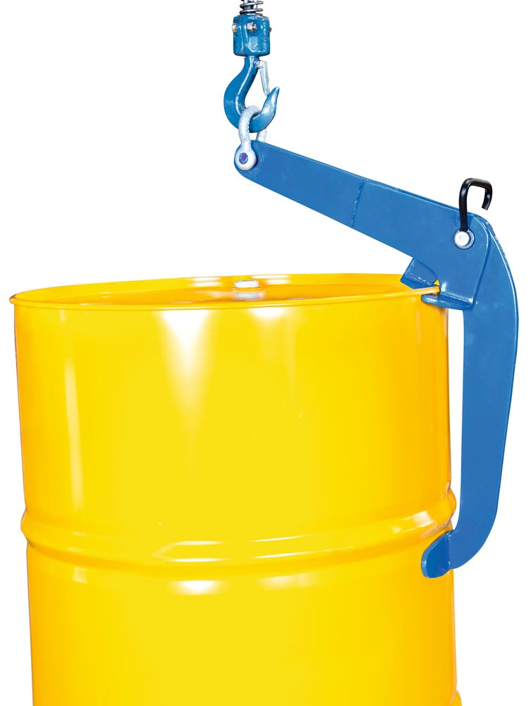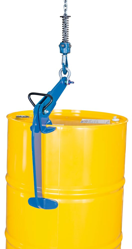 · Fasshebeklemme zum vertikalen Transport von Fässern mit Standard „Barrel“ Abmessungen · Leichte Handhabung durch einfaches Ansetzen am aufrechtstehenden Fass und automatische Verriegelung beim Anheben