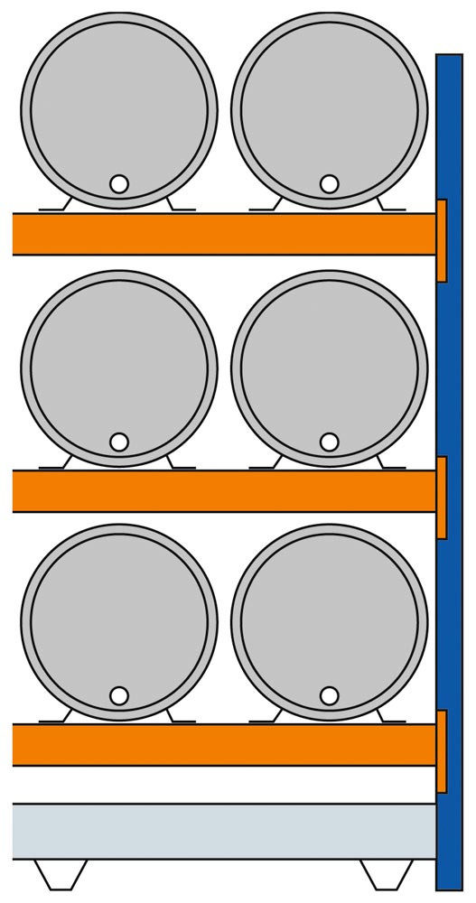 ∙ Rahmen aus Stahl, blau kunststoffbeschichtet ∙ Verstrebungen aus Stahl, verzinkt ∙ Holme aus Stahl, orange kunststoffbeschichtet ∙ Auffangwannen und Fassauflagen verzinkt ∙ Sonderausführungen wie z. B. Fass-Freilagerregale komplett mit Dach, sind auf Anfrage lieferbar ∙ Belastung pro Ebene bis 2300 kg (bei gleichmäßig verteilter Last)