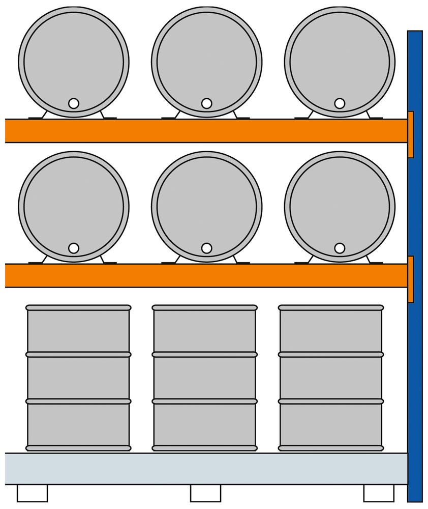 ∙ Rahmen aus Stahl, blau kunststoffbeschichtet ∙ Verstrebungen aus Stahl, verzinkt ∙ Holme aus Stahl, orange kunststoffbeschichtet ∙ Auffangwannen und Fassauflagen verzinkt ∙ Sonderausführungen wie z. B. Fass-Freilagerregale komplett mit Dach, sind auf Anfrage lieferbar ∙ Belastung pro Ebene bis 2300 kg (bei gleichmäßig verteilter Last)