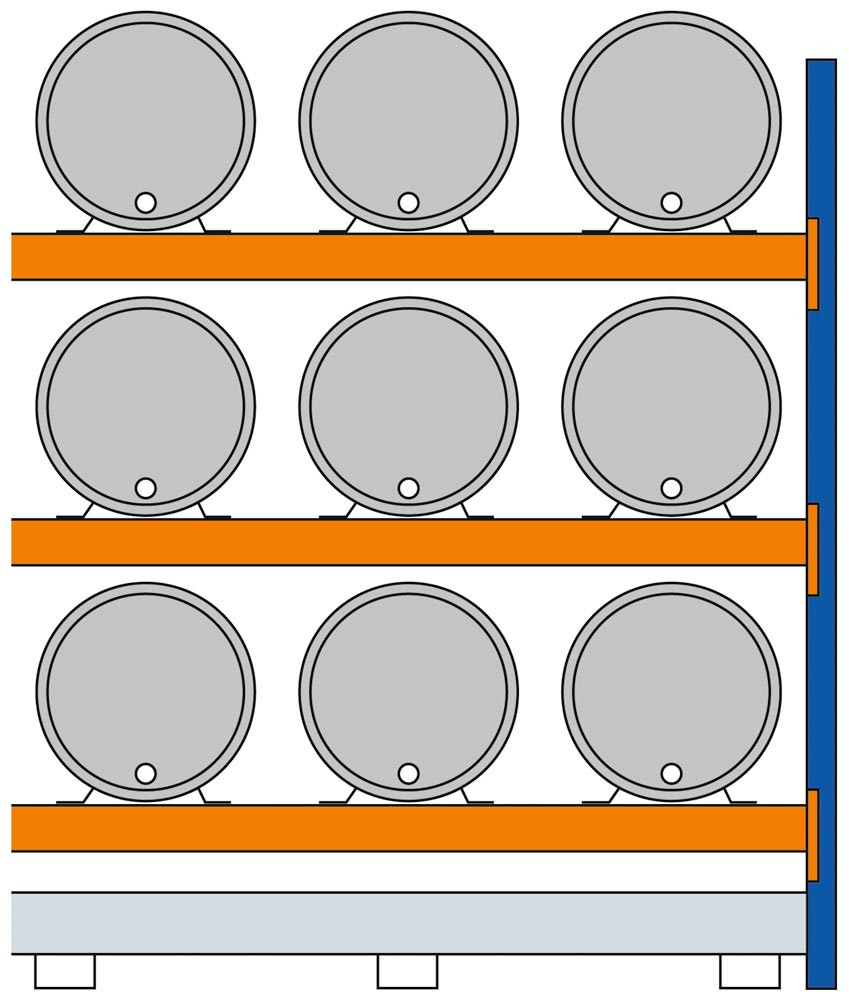 ∙ Rahmen aus Stahl, blau kunststoffbeschichtet ∙ Verstrebungen aus Stahl, verzinkt ∙ Holme aus Stahl, orange kunststoffbeschichtet ∙ Auffangwannen und Fassauflagen verzinkt ∙ Sonderausführungen wie z. B. Fass-Freilagerregale komplett mit Dach, sind auf Anfrage lieferbar ∙ Belastung pro Ebene bis 2300 kg (bei gleichmäßig verteilter Last)