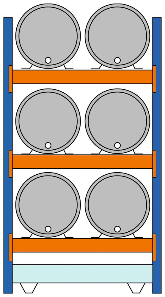 Fassregal, GF, für 6x200 l-Fässer, liegende Lagerung, mit Auffangwanne 285 l, BxTxH 1350x850x2500 mm