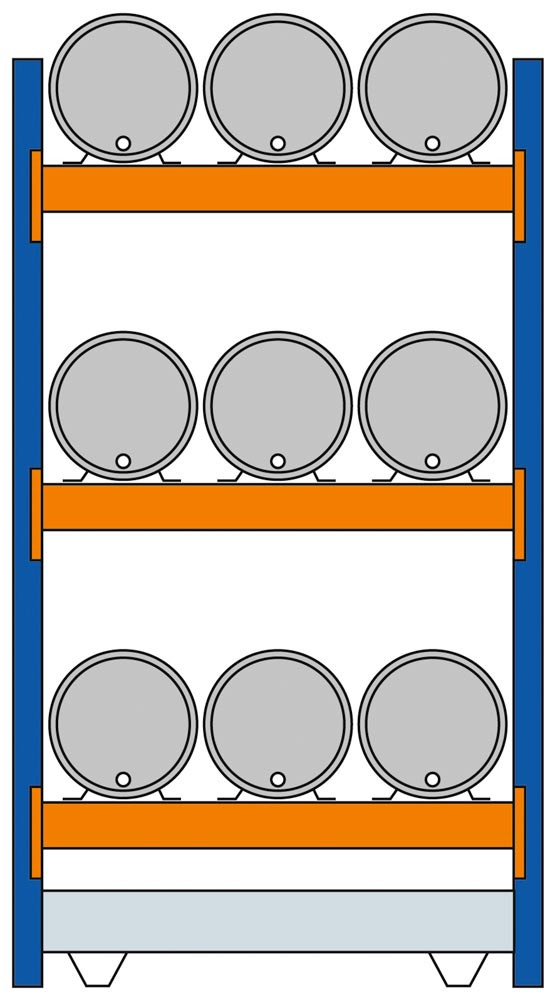 ∙ Rahmen aus Stahl, blau kunststoffbeschichtet ∙ Verstrebungen aus Stahl, verzinkt ∙ Holme aus Stahl, orange kunststoffbeschichtet ∙ Auffangwannen und Fassauflagen verzinkt ∙ Sonderausführungen wie z. B. Fass-Freilagerregale komplett mit Dach, sind auf Anfrage lieferbar ∙ Belastung pro Ebene bis 2300 kg (bei gleichmäßig verteilter Last)