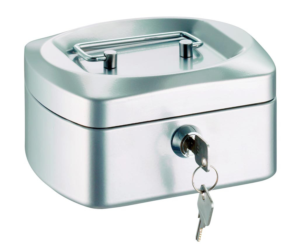 Geldkassette, BxTxH 155x120x80 mm, Stahlblech, Kunststoffeinsatz, Zylinderschloss, silber EP526948