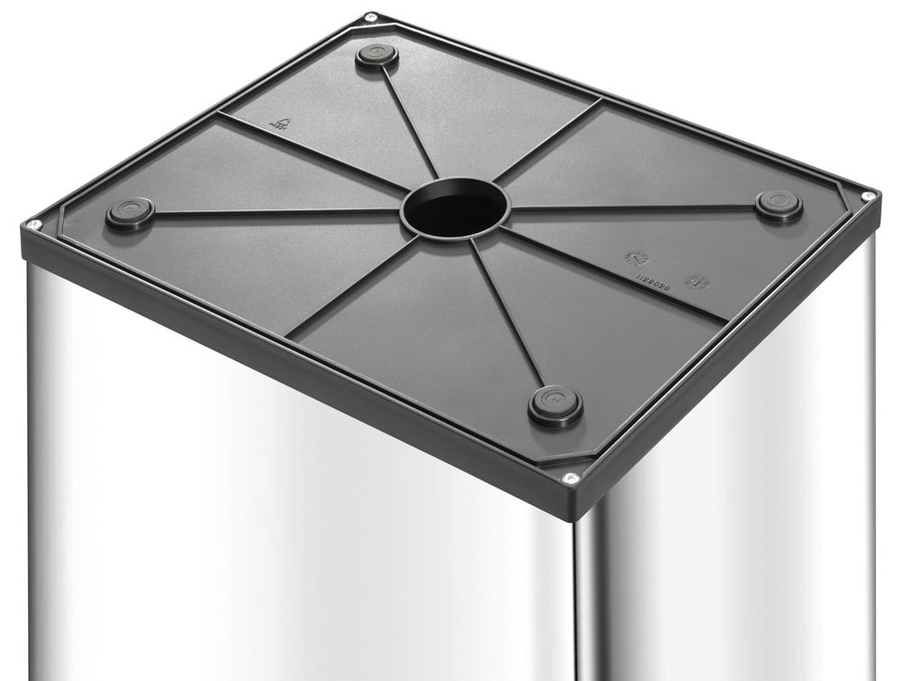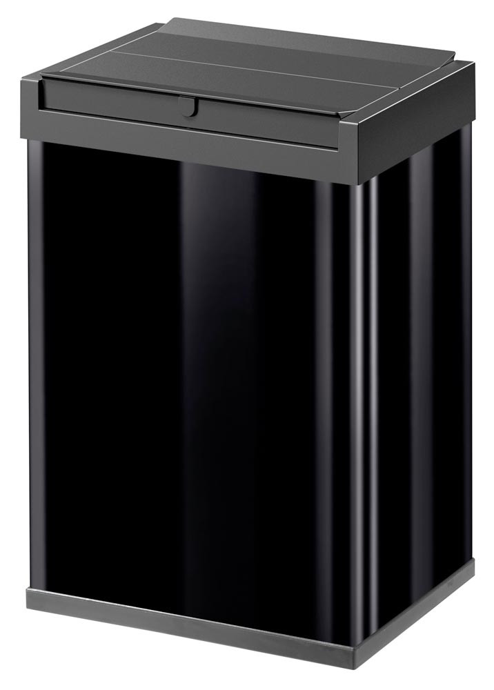 ∙ Rechteckiges Design, optimal für Mehrfachaufstellung geeignet ∙ Stabil und standfest ∙ Deckel und Boden aus hochfestem schwarzem Kunststoff · Mit patentiertem Müllbeutel-Klemmrahmen · 4 Anti-Rutsch-Füße