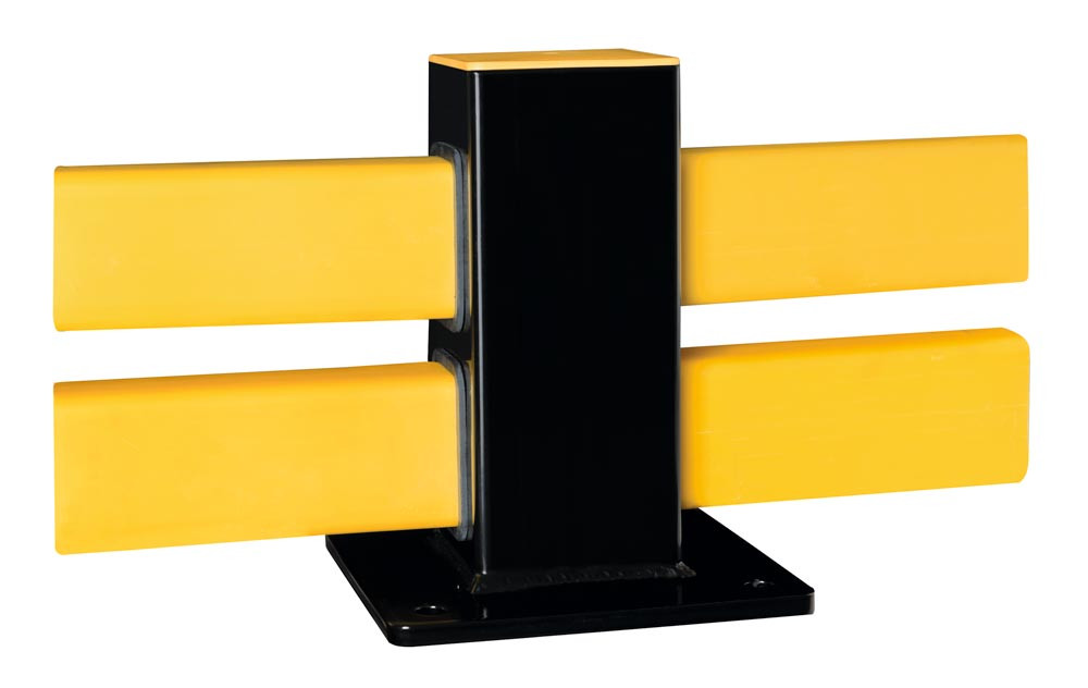 · Vielfältig einsetzbare bodennahe Barriere · Schützt Regalbereiche, Rangierzonen und Wandflächen · Dient als „Abstandhalter“ für Wand-Anbauten sowie als Säulenschutz · Die modulare Bodenbarriere besteht aus niedrigen Stahlpfosten und rückfedernden Querbalken aus Spezial-Kunststoff · Auffällige schwarz-gelbe Farbgebung