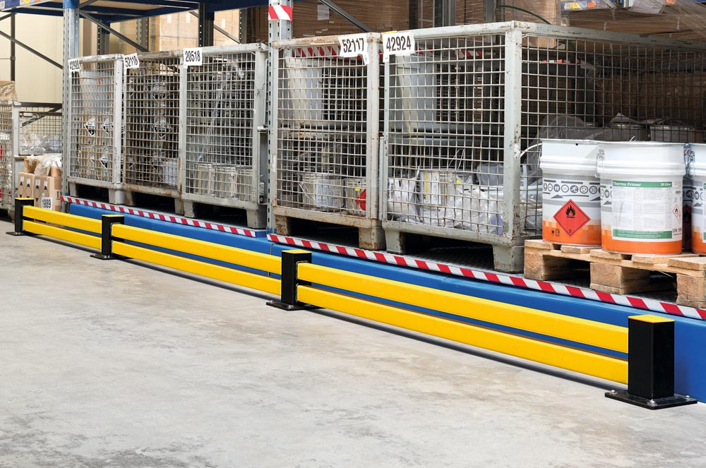 · Vielfältig einsetzbare bodennahe Barriere · Schützt Regalbereiche, Rangierzonen und Wandflächen · Dient als „Abstandhalter“ für Wand-Anbauten sowie als Säulenschutz · Die modulare Bodenbarriere besteht aus niedrigen Stahlpfosten und rückfedernden Querbalken aus Spezial-Kunststoff · Auffällige schwarz-gelbe Farbgebung