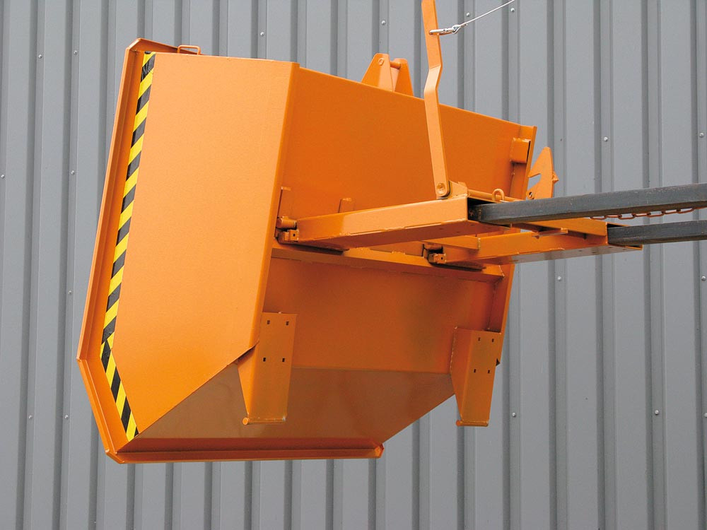 · Rechteckige Mulde des Kippbehälters iaus 3 mm Stahlblech · Stabil umlaufender Rand · Kippbar in jeder Höhe per Seilzug vom Fahrersitz aus · Durch die niedrige Bauhöhe hat der Kipper eine ideale Einwurfhöhe für Materialien jeglicher Art · Optimaler Kippwinkel für eine vollständige Entleerung bei sämtlichen Füllständen und Materialarten · Stabiler Grundrahmen mit Einfahrtaschen für die Gabelstapler-Zinken · Kettensicherung gegen ein unbeabsichtigtes Abrutschen von den Zinken · Pulverbeschichtung schützt die Oberfläche vor Korrosion