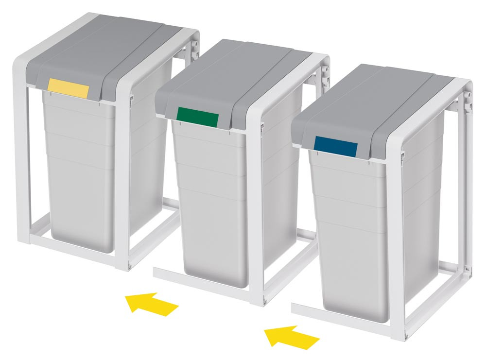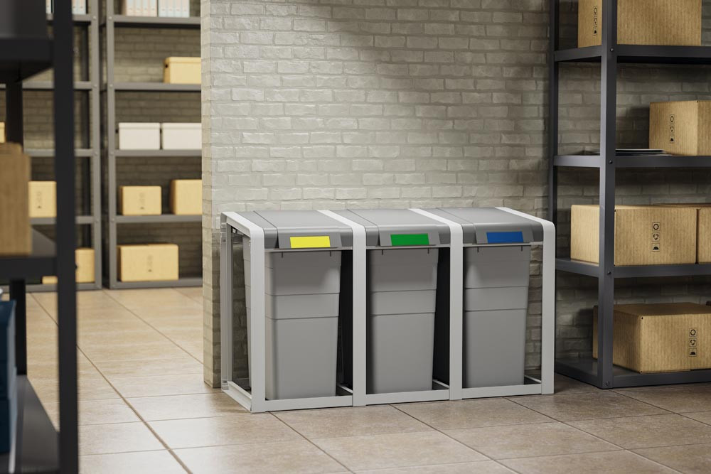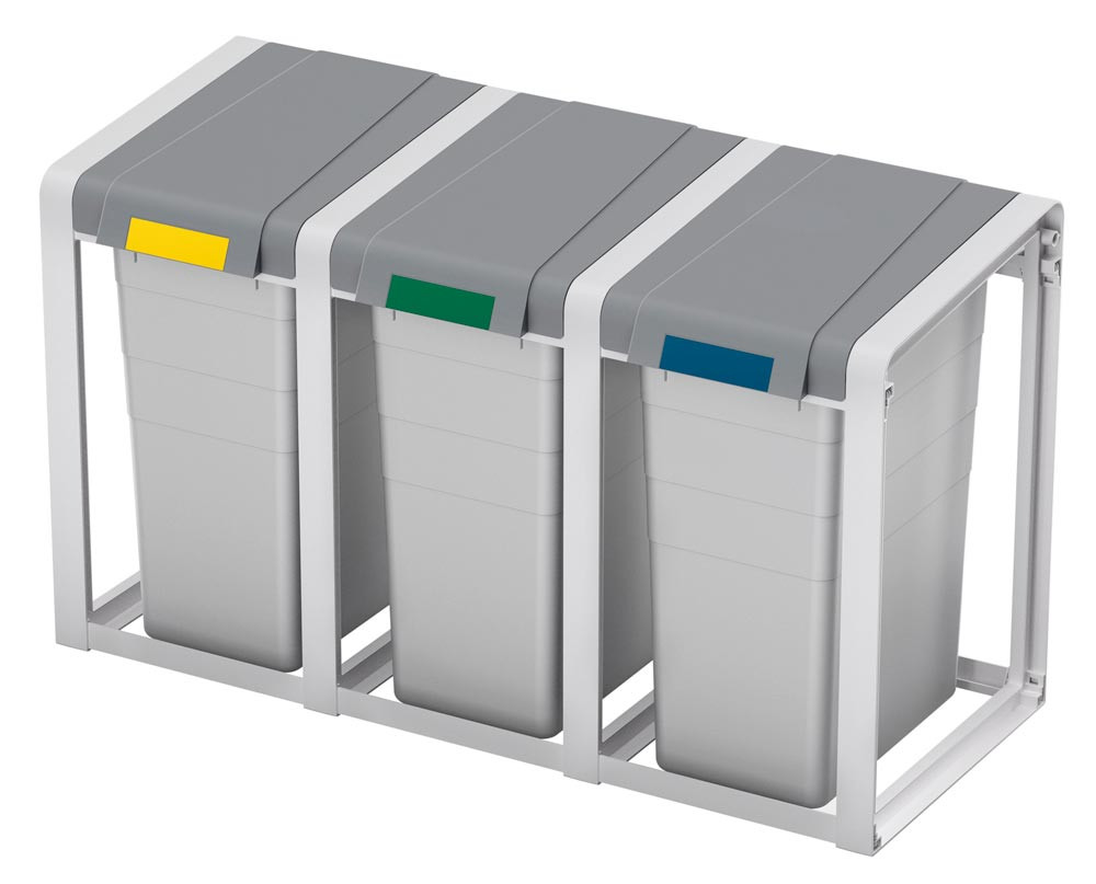 · Robustes Gestell und weit öffnender Deckel aus hochwertigem Kunststoff (ABS) · Mit herausnehmbarem Inneneimer · Mit Erweiterungseinheit beliebig erweiterbar · Inklusive Farbsticker zur Müllsorten-Kennzeichnung · Gestellfarbe telegrau · Deckelfarbe staubgrau · Eimerfarbe signalgrau