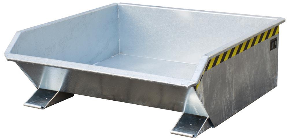 · Extrem niedrige Schüttkantenhöhe von 350 mm ∙ Mit kippbarer Mulde, 3 mm Wannenblech mit umlaufendem Randprofil ∙ Günstiger Kippwinkel, Kippen in jeder Höhe per Seilzug ∙ Sicherung gegen unbeabsichtigtes Abrutschen und Auskippen ∙ Robuste Stahlblechkonstruktion ∙ Stabiler Grundrahmen mit Einfahrtaschen · Ideal für den Einsatz unter Maschinen