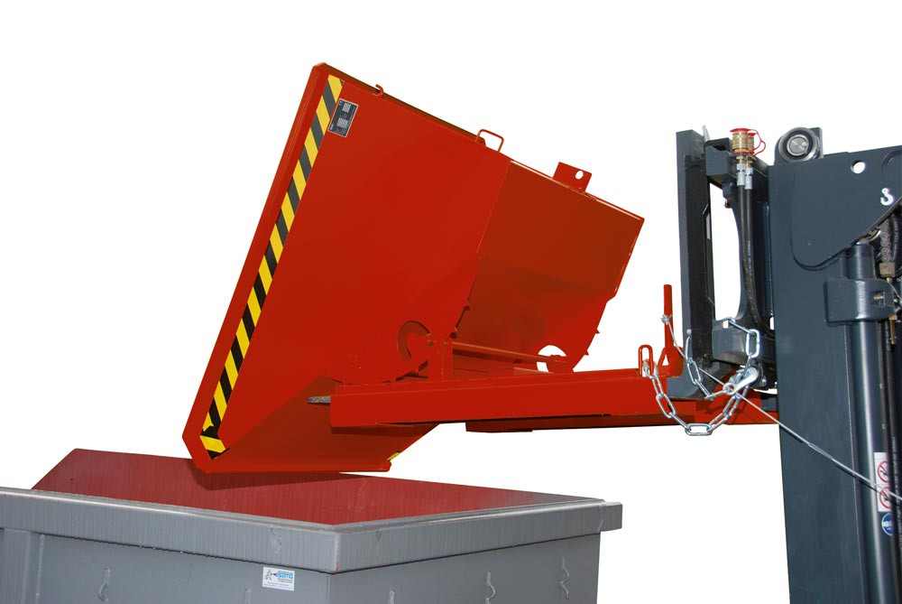 ∙ Mit Abrollsystem ∙ Mit kippbarer Mulde, 3 mm Wannenblech mit umlaufendem Randprofil ∙ Günstiger Lastschwerpunkt, Kippen in jeder Höhe per Seilzug ∙ Sicherung gegen unbeabsichtigtes Abrutschen und Auskippen ∙ Robuste Stahlblechkonstruktion ∙ Stabiler Grundrahmen mit Einfahrtaschen
