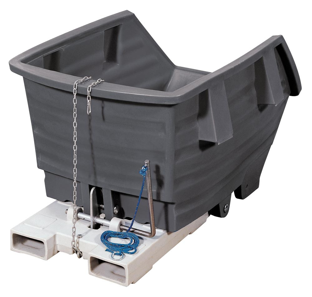 ∙ Bestehend aus Polyethylen, geringes Eigengewicht, witterungsbeständig und leicht zu reinigen ∙ Sicheres Aufbewahren von Gebinden mit Säuren, Laugen, Ölen, nicht brennbaren Reinigungslösungen, etc. · Lebensmittelecht ∙ Bedienung der Arretierungseinrichtung löst unmittelbar den Kippvorgang (90°) aus