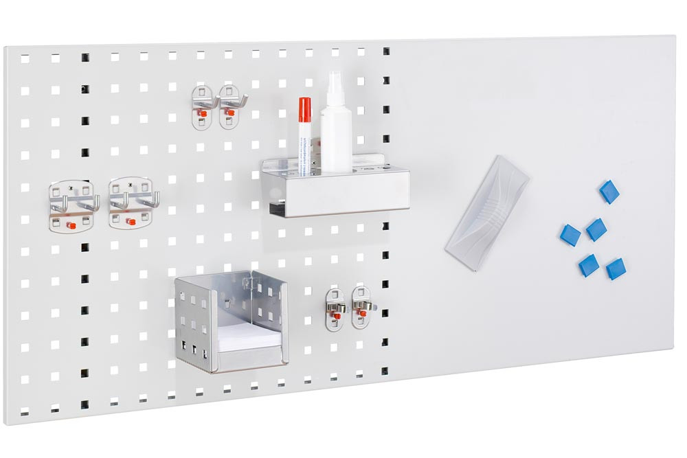 Organisationswand, BxH 1000x450 mm, RAL 7035, Beschriftungsfläche rechts, Lochplattenfläche links, inkl. Zubehör, Set 2