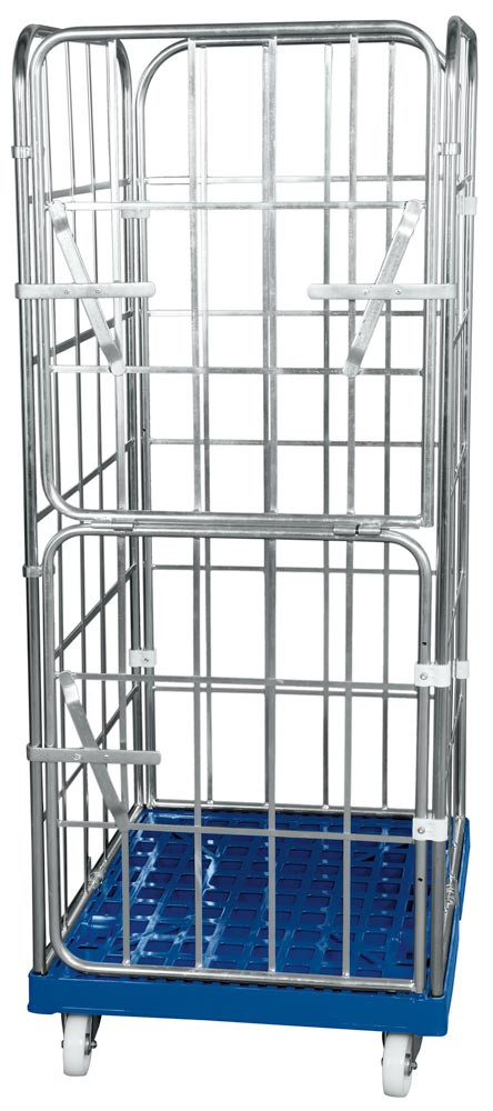 ∙ 2 Seitenwände, 1 Rückwand und 1 Vorderwand halb klapp- und schwenkbar, galvanisch blau verzinkt ∙ Robuste Rohrkonstruktion Ø 22 mm ∙ Ausfachungen mit 4 senkrechten und 4 bzw. waagerechten Flacheisen 12 x 3 mm ∙ Bodenplatte mit 2 Metallschienen als Rahmenverstärkung · 2 Lenk- und 2 Bockrollen Ø 108 mm aus Polypropylen mit Fadenschutz und verschraubter Radachse