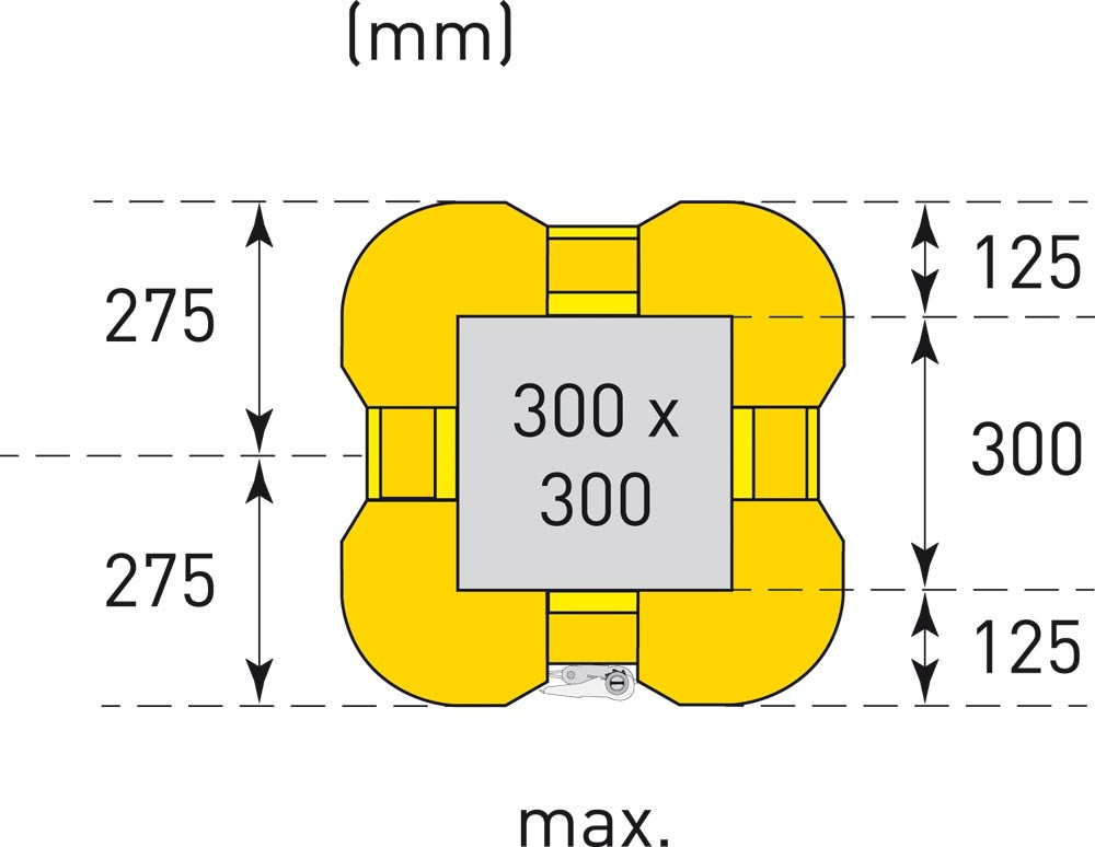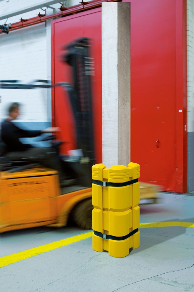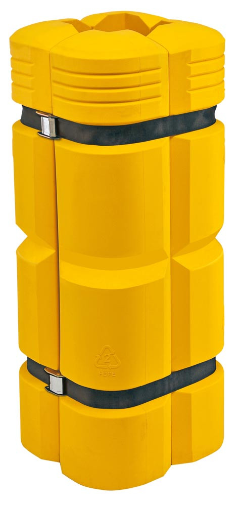 · Aus modifiziertem, gelb durchgefärbtem Polyethylen · Schutz von Rechtecksäulen vor Anfahrschäden durch Stapler, Flürförderzeuge oder Lastkraftwagen · Säulenschutz bestehend aus 4 ineinander schiebaren Einzelelementen · Für alle Säulenmaße B x T von mind. 200 x 200 mm und max. 300 x 300 mm, einschließlich aller Rechteckgrößen · 2 Spanngurte (je 2,2 m) sorgen für festen Verbund · Für den Innen- und Außeneinsatz geeignet · TÜV-geprüft