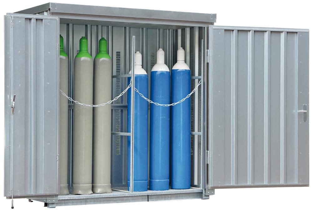 · Sichere Gasflaschenlagerung im Freien, entsprechend TRGS 510 ∙ Seitenwand, Dach und Türtafeln aus feuerverzinkten Trapezblechen ∙ Standardtür mit Sicherheitsschloss ∙ Ortsbezogene geprüfte Statik ∙ Verstellbare Haltevorrichtungen mit zusätzlichen Sicherungsketten, komplett verzinkt ∙ Konstruktive, permanente Eigenbelüftung ∙ Vorgesehen zur bauseitigen Verankerung ∙ Vereint die Vorteile eines geschlossenen Lagersystems mit denen einer Drahtgitterkonstruktion