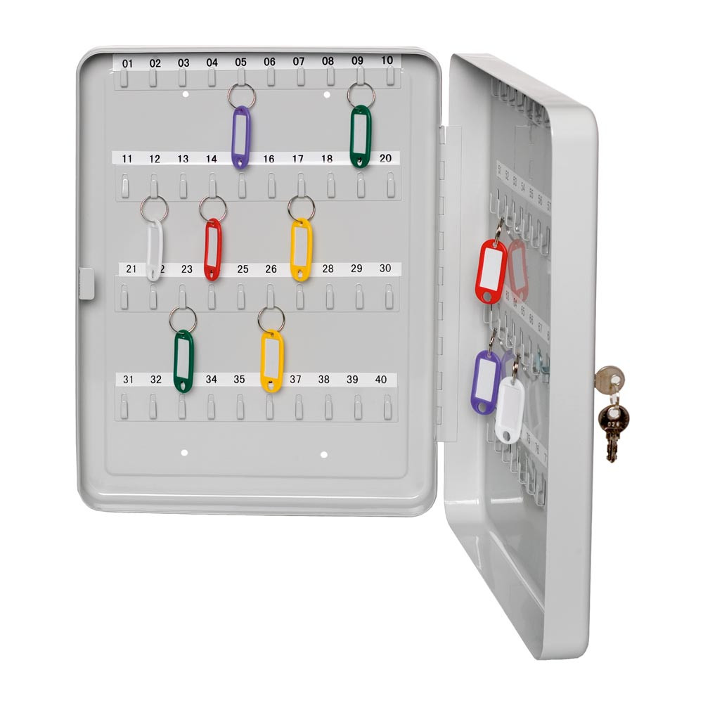 ∙ Aus Stahlblech · Drehriegel-Zylinderschloss mit 2 Schlüsseln · Nummerierte Haken (Schlüsselanhänger nicht im Lieferumfang enthalten) · Inkl. Befestigungsmaterial