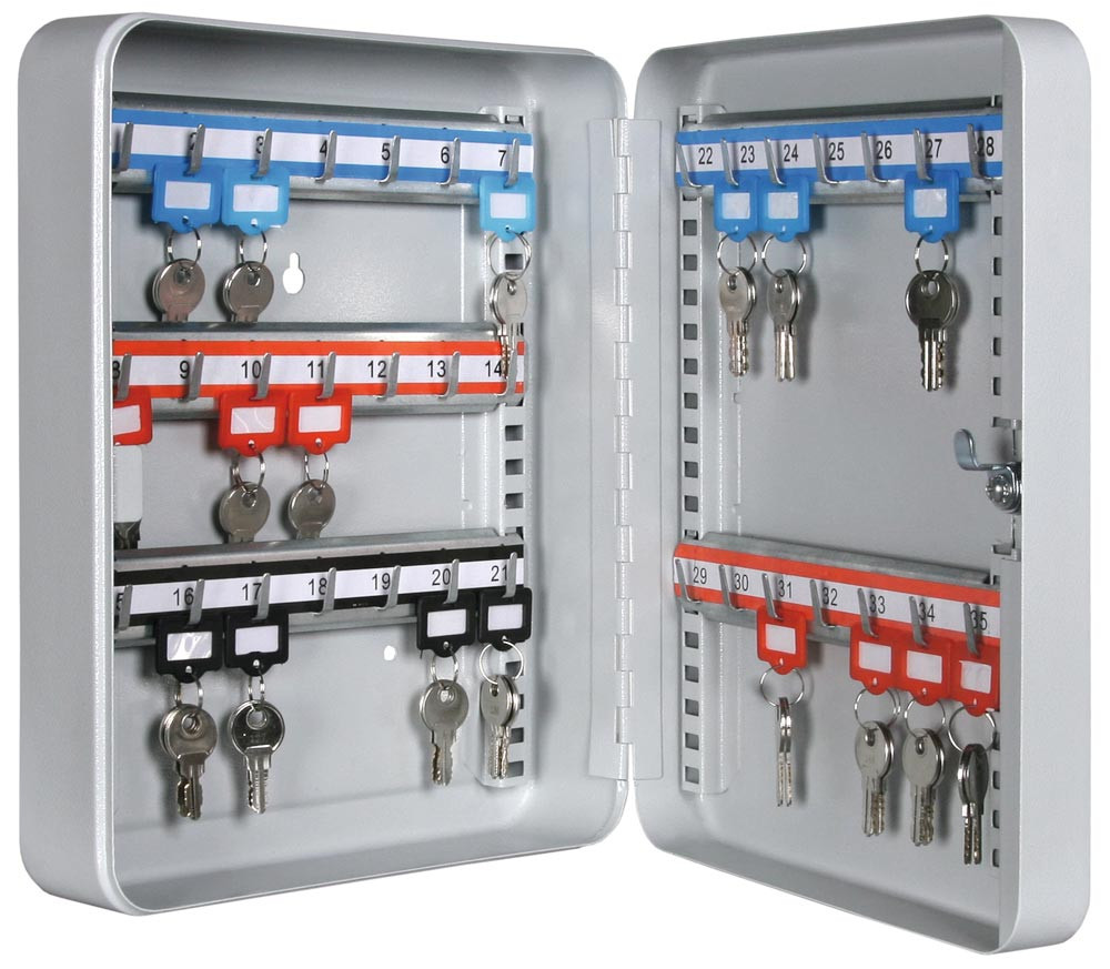 Schlüsselkassetten, Stahlblech, Raster-Hakenleisten, 40 Haken, Zylinderschloss, BxTxH 230x75x320 mm