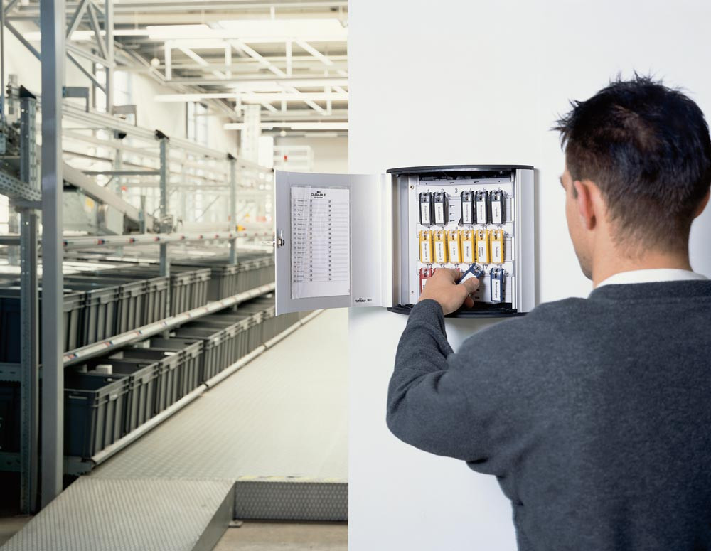 ∙ Hochwertige Design-Schlüsselkästen ∙ Farbe metallic-silber · Türöffnungswinkel mehr als 90° · Verstellbare Hakenleisten im Stecksystem · Indexblatt in der Tür ∙ Inkl. Musterbeutel mit 6 farbig sortierten Schlüsselanhängern · Inkl. Montagematerial