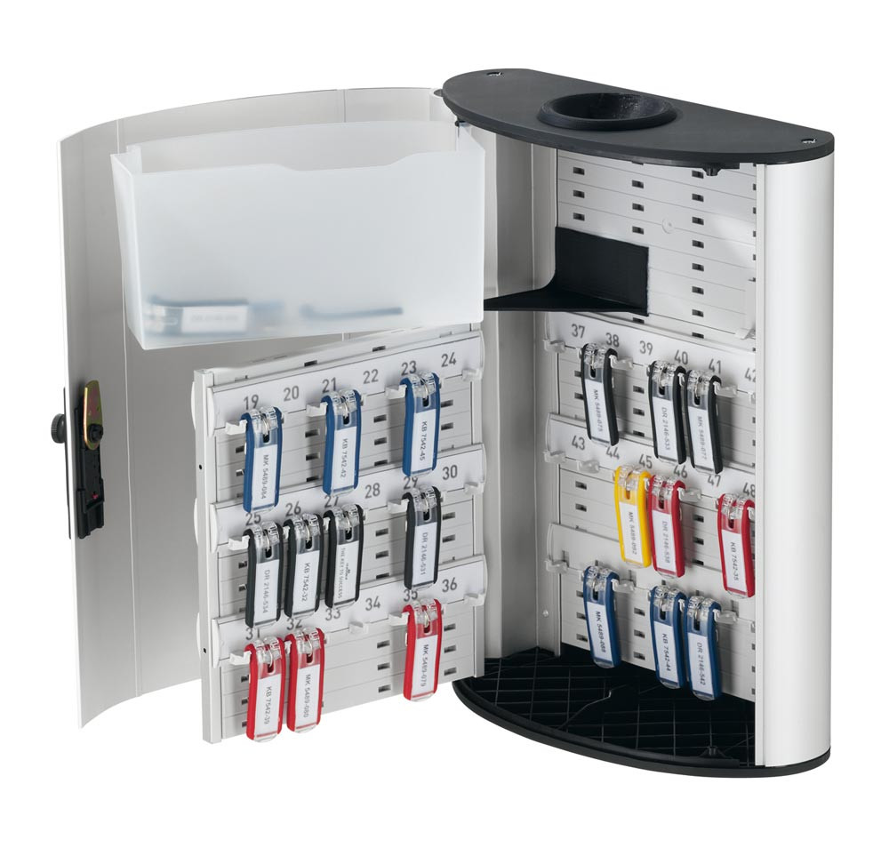 ∙ Hochwertige Design-Schlüsselkästen ∙ Farbe metallic-silber · Türöffnungswinkel mehr als 90° · Verstellbare Hakenleisten im Stecksystem · Indexblatt in der Tür ∙ Inkl. Musterbeutel mit 6 farbig sortierten Schlüsselanhängern · Inkl. Montagematerial