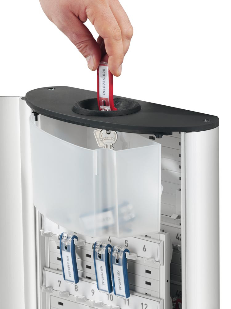 · Zur schnellen Rückgabe von Schlüsseln · Einwurföffnung im Deckel · Schwenkbare Auffangschale im Inneren