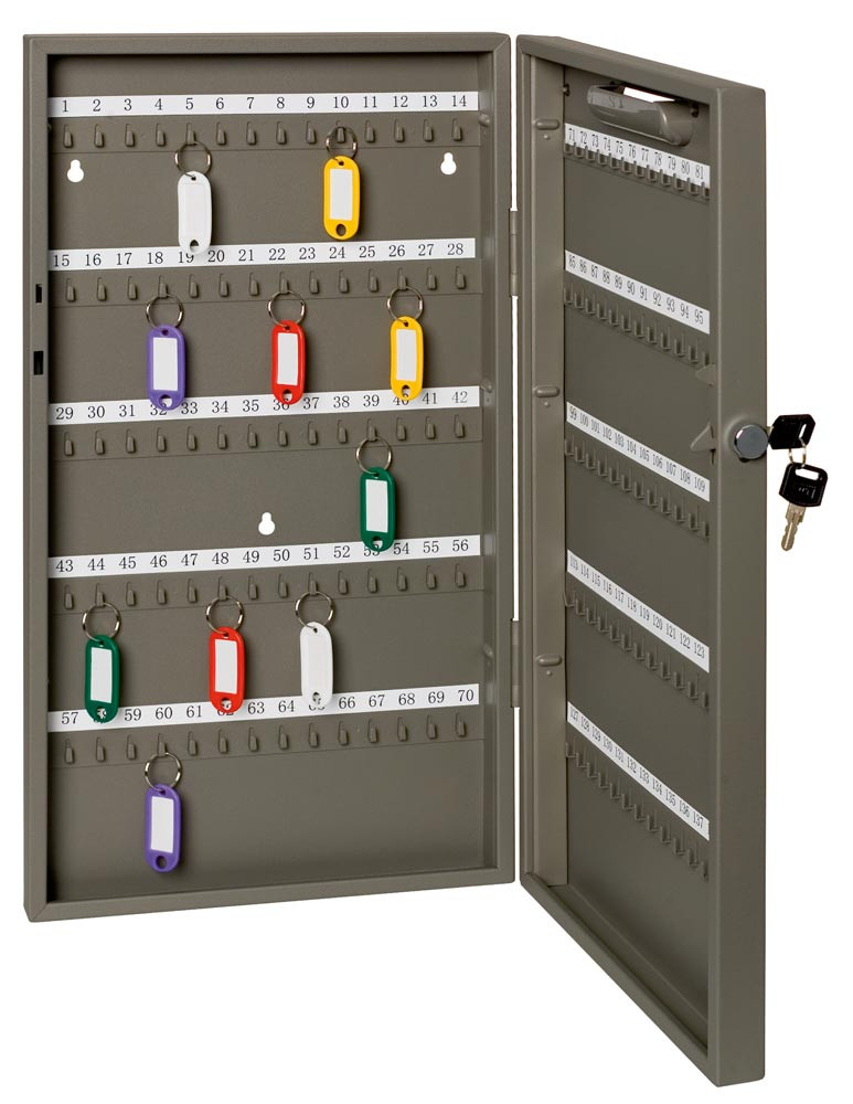 ∙ Aus Stahlblech · Drehriegel-Zylinderschloss mit 2 Schlüsseln · Nummerierte Haken (Schlüsselanhänger nicht im Lieferumfang enthalten) · Inkl. Befestigungsmaterial