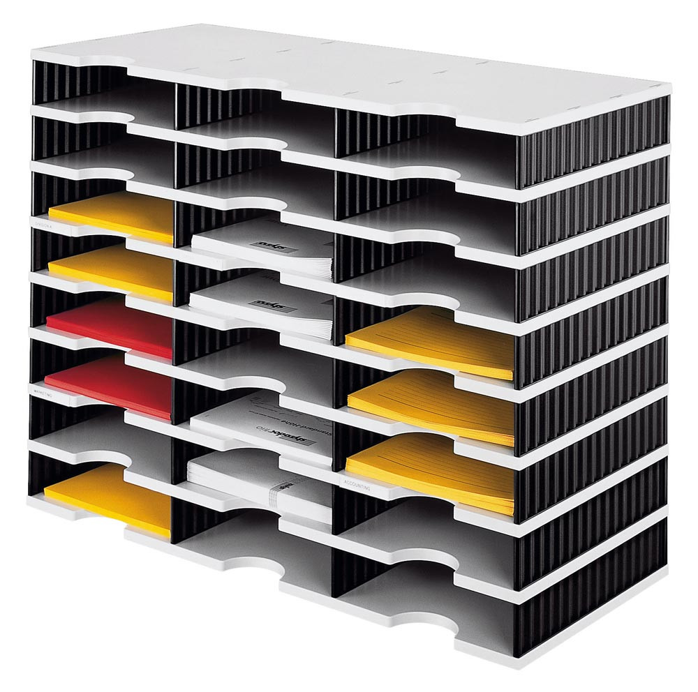 · Zur Verwahrung von Kopierpapier, Zeitschriften, etc. oder als Postsortieranlage · Durch Aufbaumodule jederzeit erweiter- und kombinierbar · Aus hochbelastbarem Polystyrol · Boden in grau, Seitenteile farblich abgesetzt · Inkl. Beschriftungsschilder · Anlieferung erfolgt zerlegt im handlichen Karton