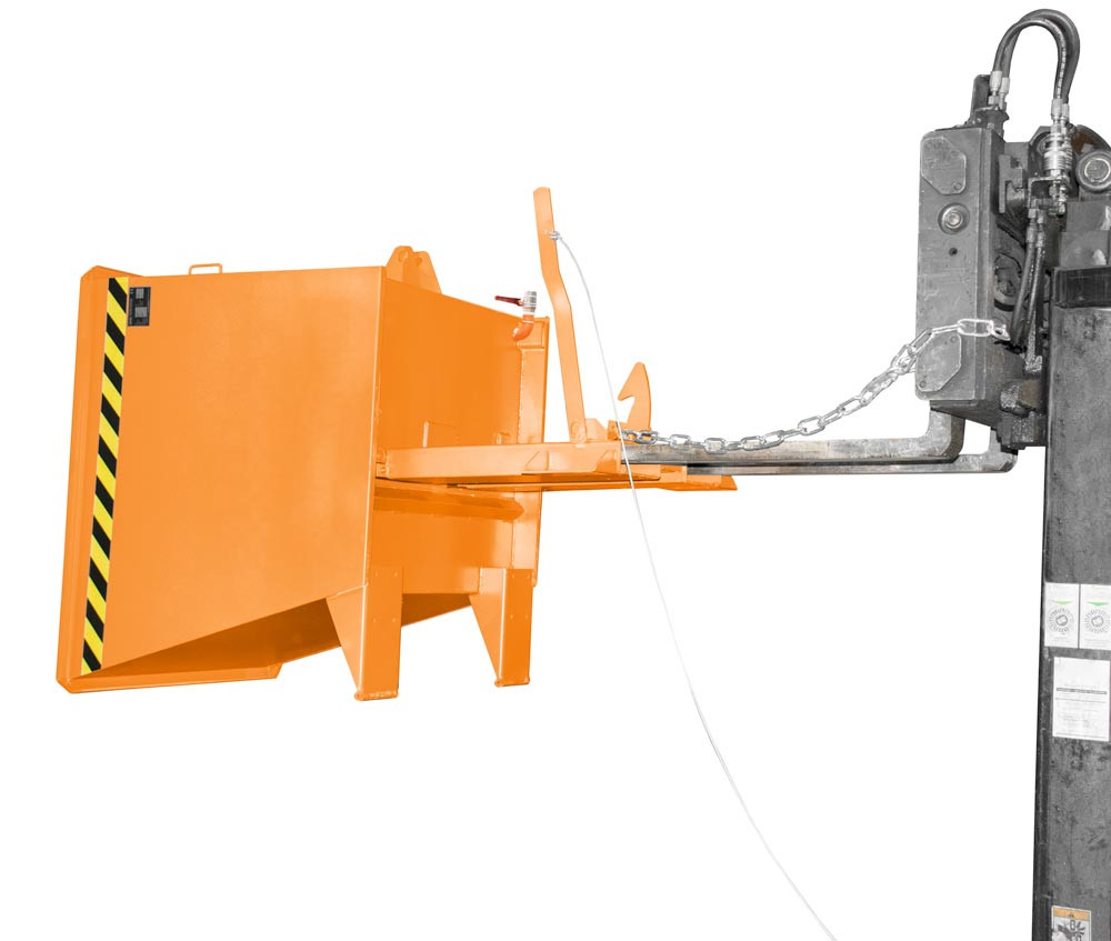 · Stahlkonstruktion aus Wannenblech mit umlaufendem Randprofil · Kippen des Behälters in jeder Höhe per Seilzug · Robuster Grundrahmen mit Einfahrtaschen · Sicherung gegen unbeabsichtigtes Abrutschen und Auskippen