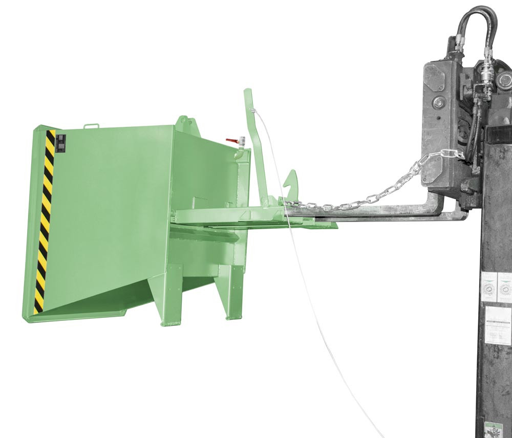 · Stahlkonstruktion aus Wannenblech mit umlaufendem Randprofil · Kippen des Behälters in jeder Höhe per Seilzug · Robuster Grundrahmen mit Einfahrtaschen · Sicherung gegen unbeabsichtigtes Abrutschen und Auskippen