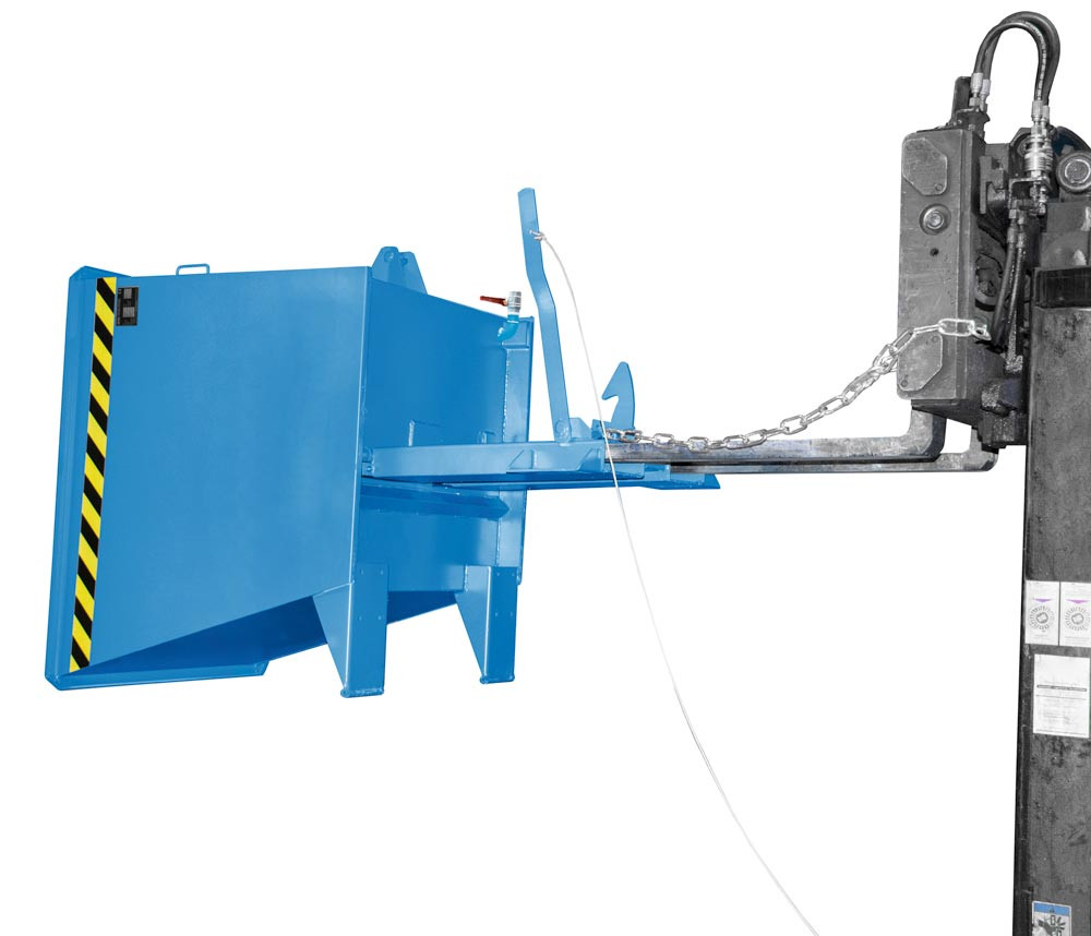 · Stahlkonstruktion aus Wannenblech mit umlaufendem Randprofil · Kippen des Behälters in jeder Höhe per Seilzug · Robuster Grundrahmen mit Einfahrtaschen · Sicherung gegen unbeabsichtigtes Abrutschen und Auskippen