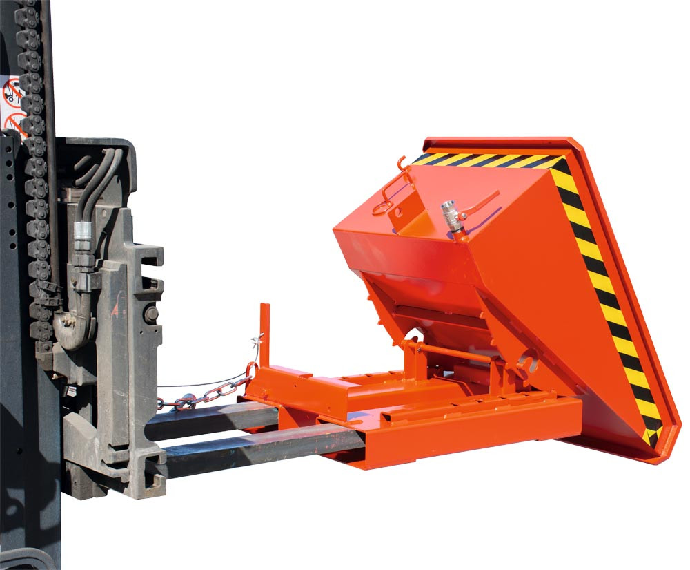 · Robuste Stahlblechkonstruktion, 3 mm Wannenblech mit umlaufend Randprofil · Siebblech und Ablasshahn 1" zum Trennen der Flüssigkeiten von Feststoffen · Öl- und wasserdicht · Günstiger Lastschwerpunkt · Kippen in jeder Höhe per Seilzug vom Staplersitz aus · Nach erfolgter Entleerung schwenkt der Behälter selbstständig in die Ladestellung zurück · Stabiler Grundrahmen mit Einfahrtaschen · Sicherung gegen Abrutschen und unbeabsichtigtes Auskippen