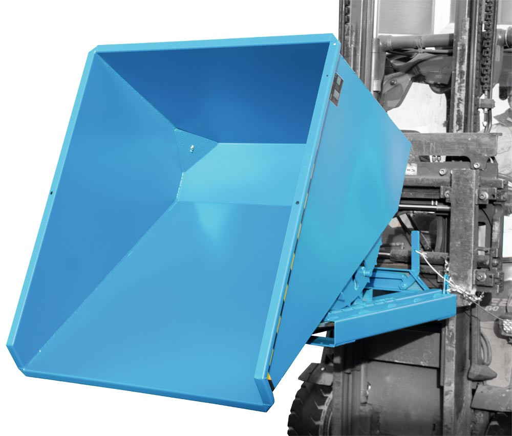 · Robuste Stahlblechkonstruktion, 3 mm Wannenblech mit umlaufend Randprofil · Siebblech und Ablasshahn 1" zum Trennen der Flüssigkeiten von Feststoffen · Öl- und wasserdicht · Günstiger Lastschwerpunkt · Kippen in jeder Höhe per Seilzug vom Staplersitz aus · Nach erfolgter Entleerung schwenkt der Behälter selbstständig in die Ladestellung zurück · Stabiler Grundrahmen mit Einfahrtaschen · Sicherung gegen Abrutschen und unbeabsichtigtes Auskippen