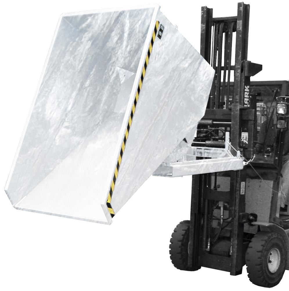 · Robuste Stahlblechkonstruktion, 3 mm Wannenblech mit umlaufend Randprofil · Siebblech und Ablasshahn 1" zum Trennen der Flüssigkeiten von Feststoffen · Öl- und wasserdicht · Günstiger Lastschwerpunkt · Kippen in jeder Höhe per Seilzug vom Staplersitz aus · Nach erfolgter Entleerung schwenkt der Behälter selbstständig in die Ladestellung zurück · Stabiler Grundrahmen mit Einfahrtaschen · Sicherung gegen Abrutschen und unbeabsichtigtes Auskippen