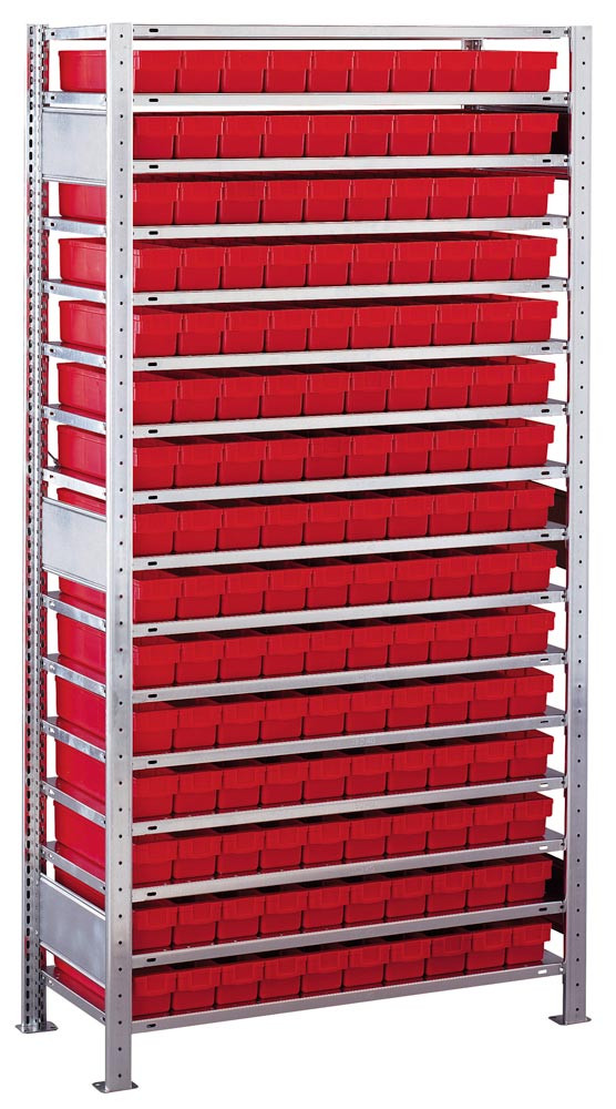 Steckegal, verzinkt, mit Kästen, Grundfeld, BxTxH 1000x600x2000 mm, 16 Böden, 150 rote Kästen, BxTxH 93x600x83 mm