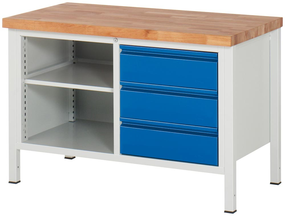 Werkbank, BxTxH 1250x700x840 mm, Platte Buche 40 mm, 3 Schublade 180 mm, 1 Fachboden, RAL 7035/5010