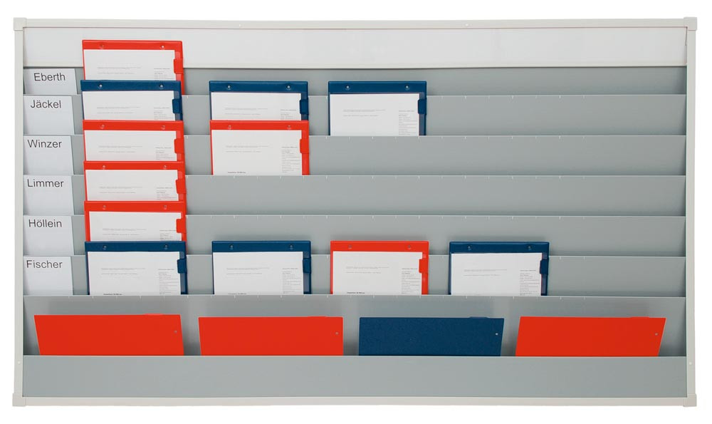 Kunststoff Polypropylen grau · sehr gut geeignet für Betriebsabläufe · mit individueller Beschriftungsmöglichkeit · für Auftragstaschen oder Belege DIN A4 · mit Ablagefach · Einstecktiefe 210 mm, Sichtrand 96 mm · Lieferung inkl. Befestigungsmaterial