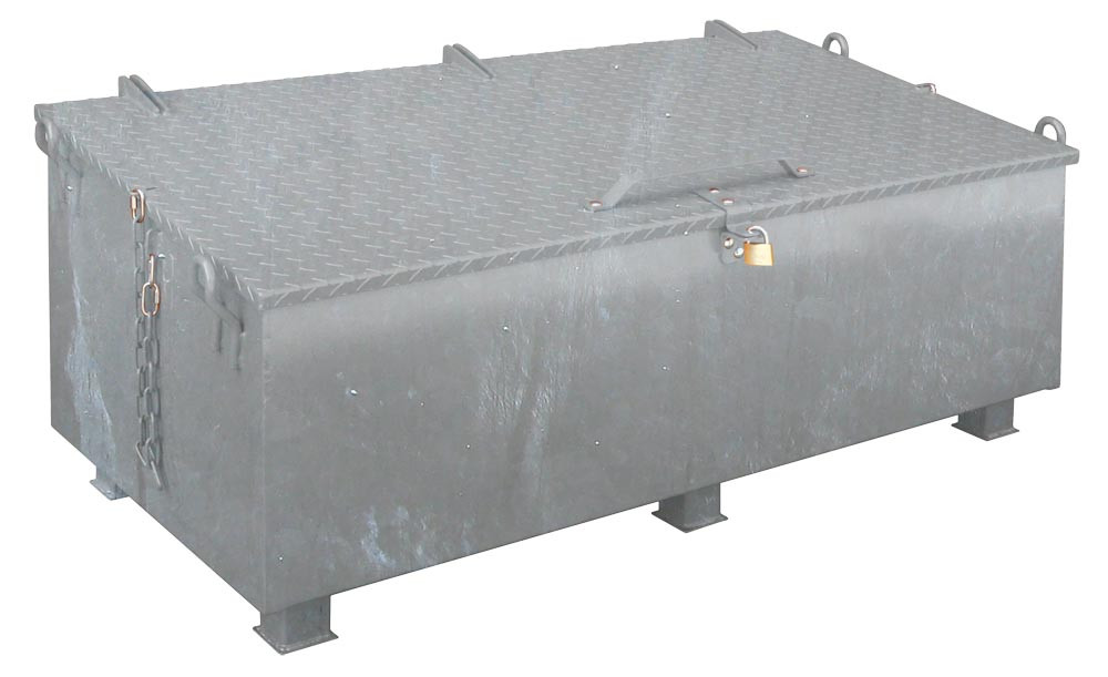 · Robuste, geräumige Werkzeugkiste aus Stahlblech · Standfüße vermeiden eine Kontaktkorrosion und garantieren ein leichtes Einfahren mit Gabelstapler und Hubgeräten · Traglast bis 800 kg· Serienmäßig mit 4 Haken für den Transport mit einem Kran · Der Deckel ist aus Riffelblech und Ösen für ein Vorhängeschloss versehen